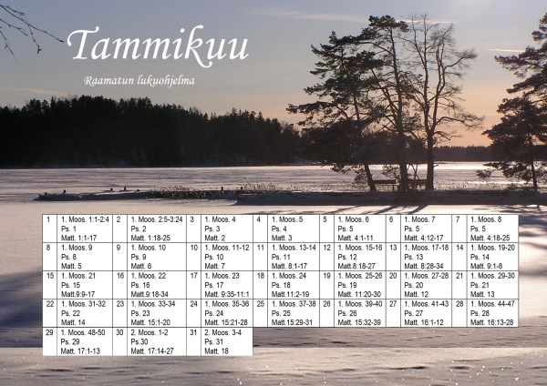 Vuoden kirjan jokaisella sivulla on kullekin päivälle raamatunkohdat luettavaksi sekä Vanhasta että Uudesta Testamentista. Aloitamme Mooseksen kirjoista ja luemme evankeliumit vuorotellen läpi. Rinnalla kulkevat ensin Psalmit ja myöhemmin muut runolliset kirjat. Vuoden mittaan Raamattu tulee luetuksi kokonaan. Tervetuloa päivittäin mukaan tutkimaan ihmeellistä Raamattua. PS. Kalenterisivut saa printata itselleen ja jakaa ystävilleenkin! =)