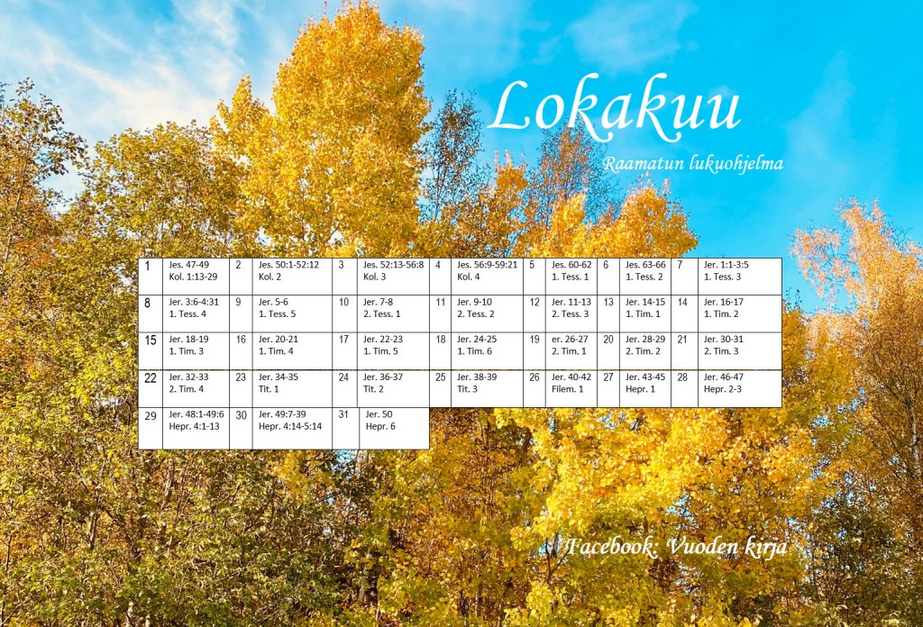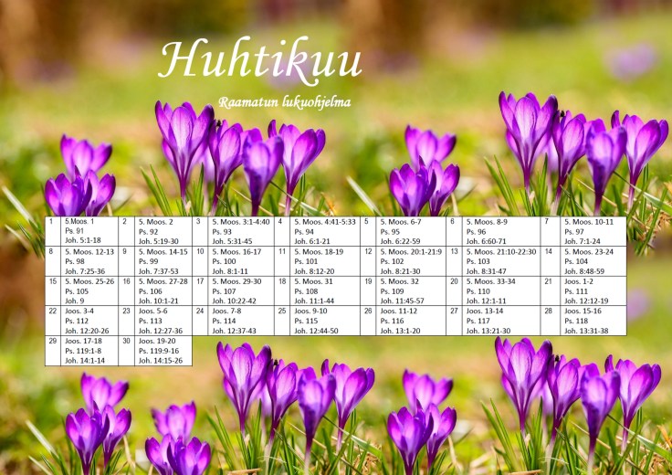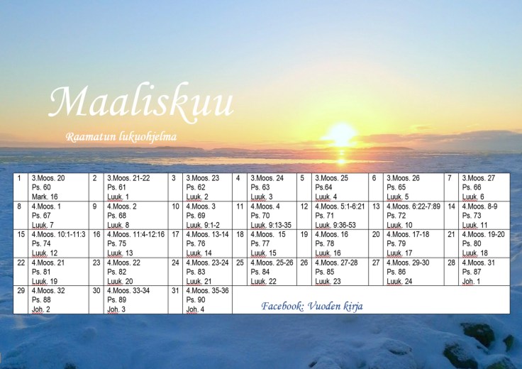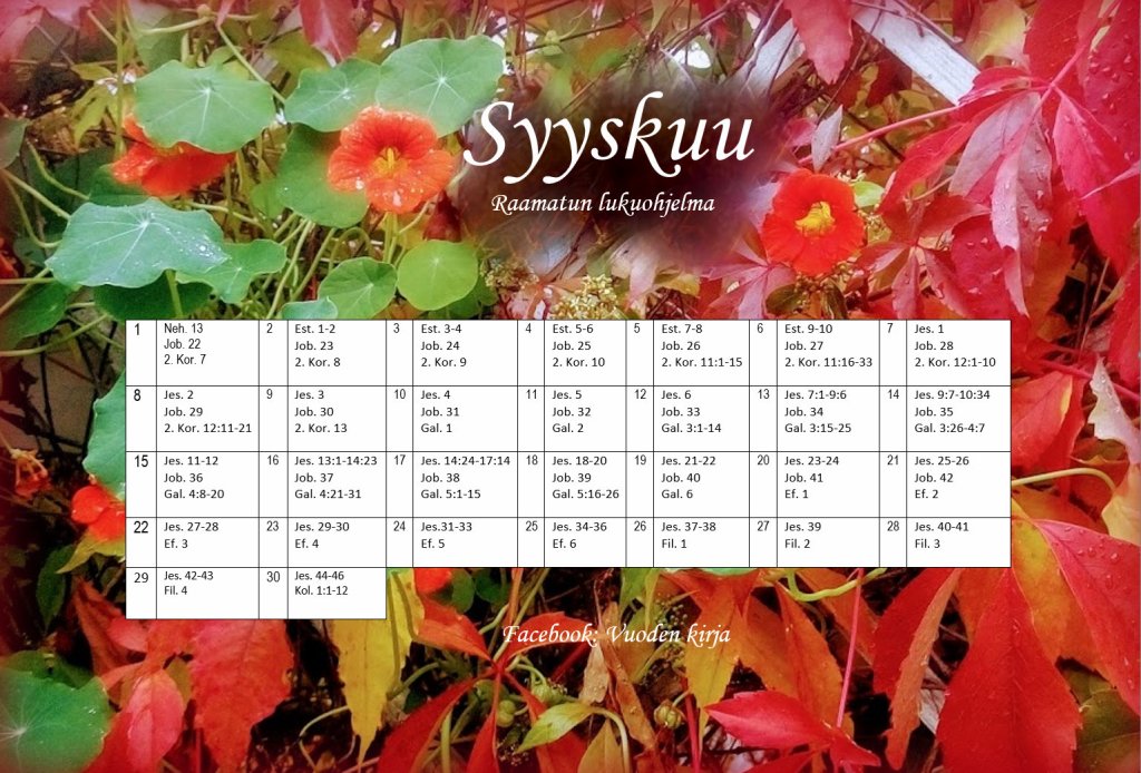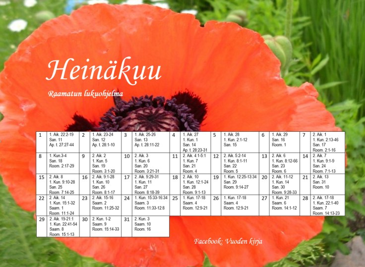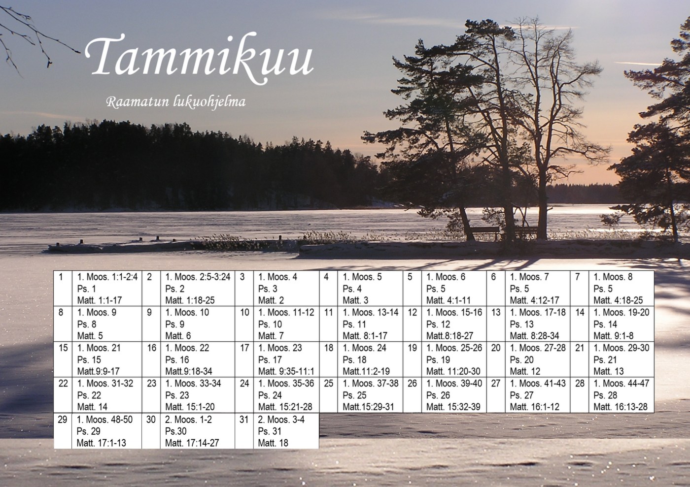 Vuoden kirjan jokaisella sivulla on kullekin päivälle raamatunkohdat luettavaksi sekä Vanhasta että Uudesta Testamentista. Aloitamme Mooseksen kirjoista ja luemme evankeliumit vuorotellen läpi. Rinnalla kulkevat ensin Psalmit ja myöhemmin muut runolliset kirjat. Vuoden mittaan Raamattu tulee luetuksi kokonaan.